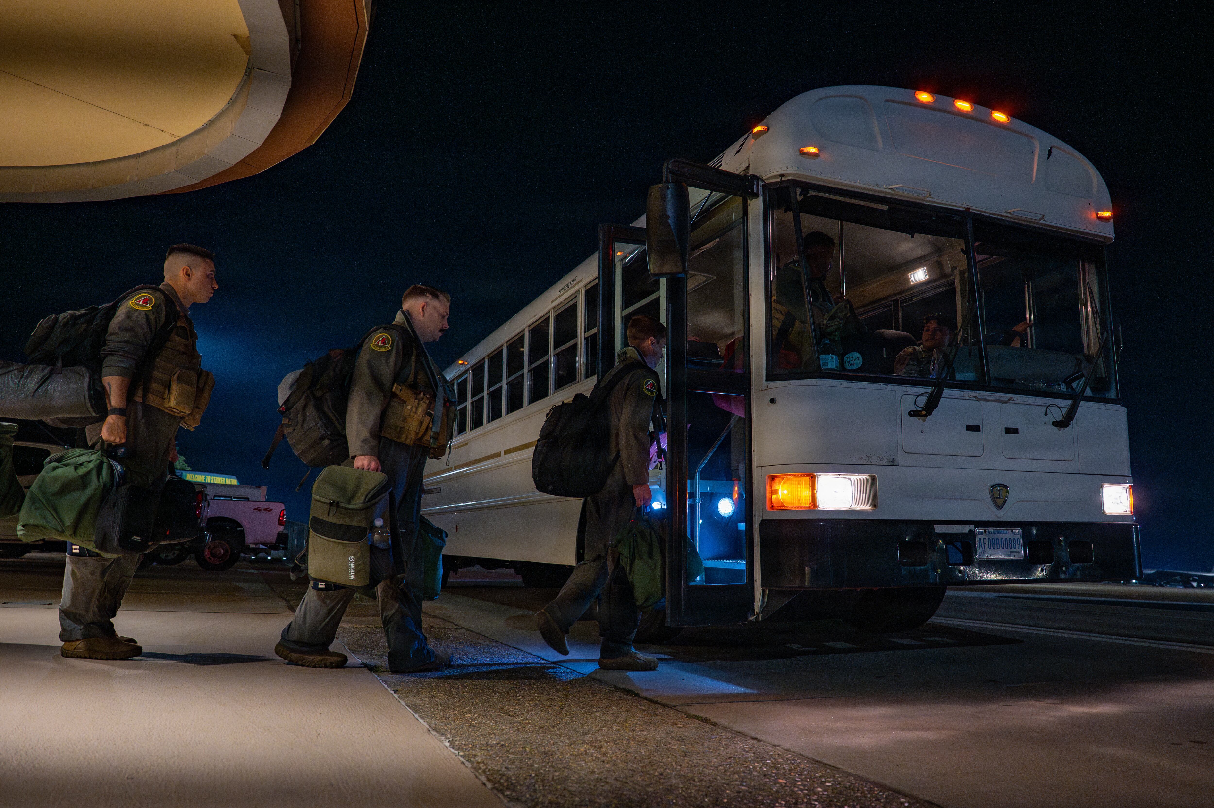 A U.S. Air Force B-52 Stratofortress bomber aircrew from the 96th Bomb Squadron board a bus at Barksdale Air Force Base, Louisiana, Oct. 15, 2025. (Airman 1st Class Devyn Taylor/Air Force)