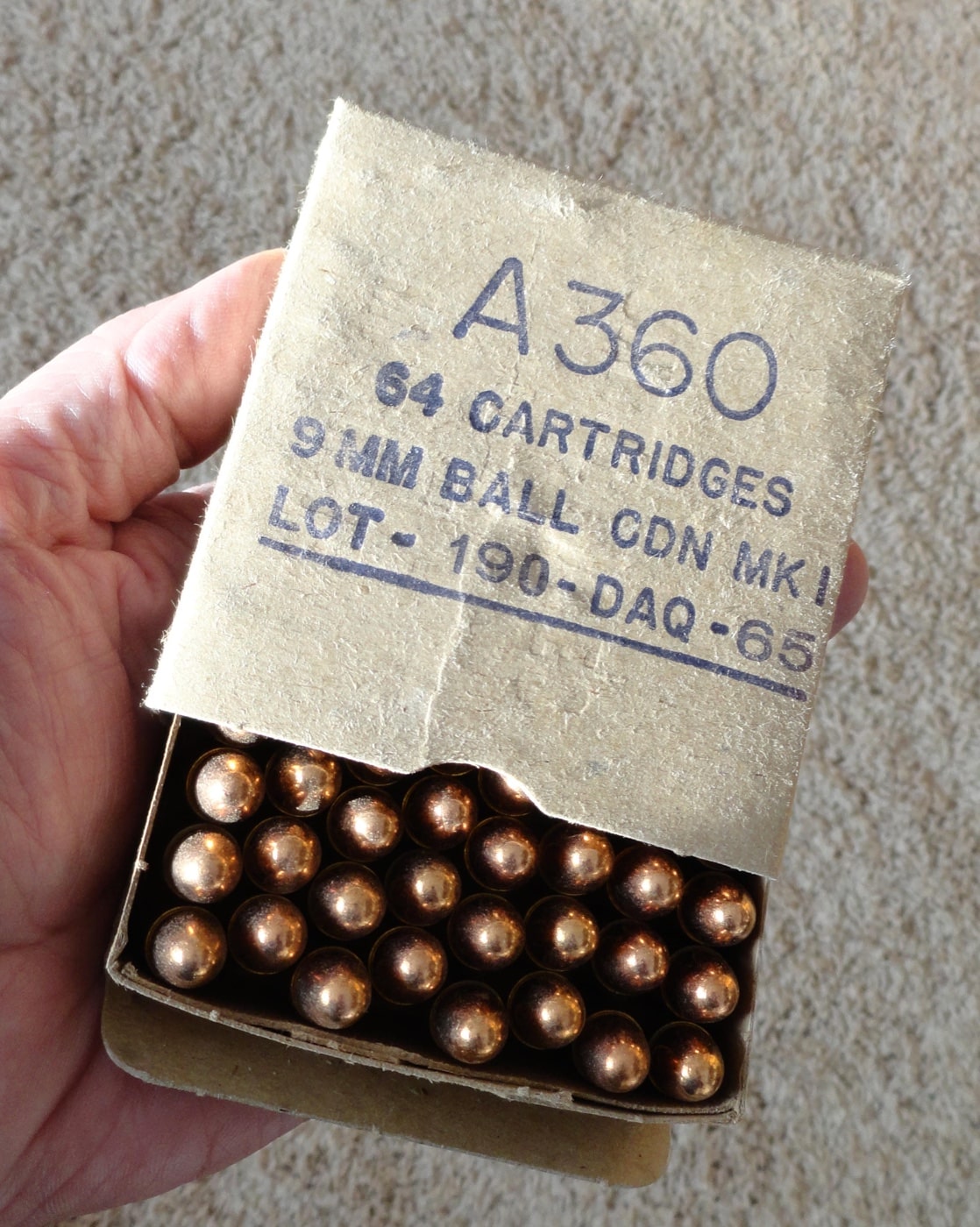 Like our pistols, our 9mm ammunition, too, was acquired untraceably. Manufactured at Canada’s Dominion Arsenal in Quebec, it came packed in 64-round boxes, which makes sense since Canadian STEN and Sterling 9mm SMGs have 32-round magazines. The Canadian load incorporated a 117-gr. bullet with a muzzle velocity of 1,247 fps. The round’s shortcoming — as with all hardball 9x19mm — was terminal effect. Unlike the advanced defense loads of today, hardball 9mm proved to be not especially lethal.