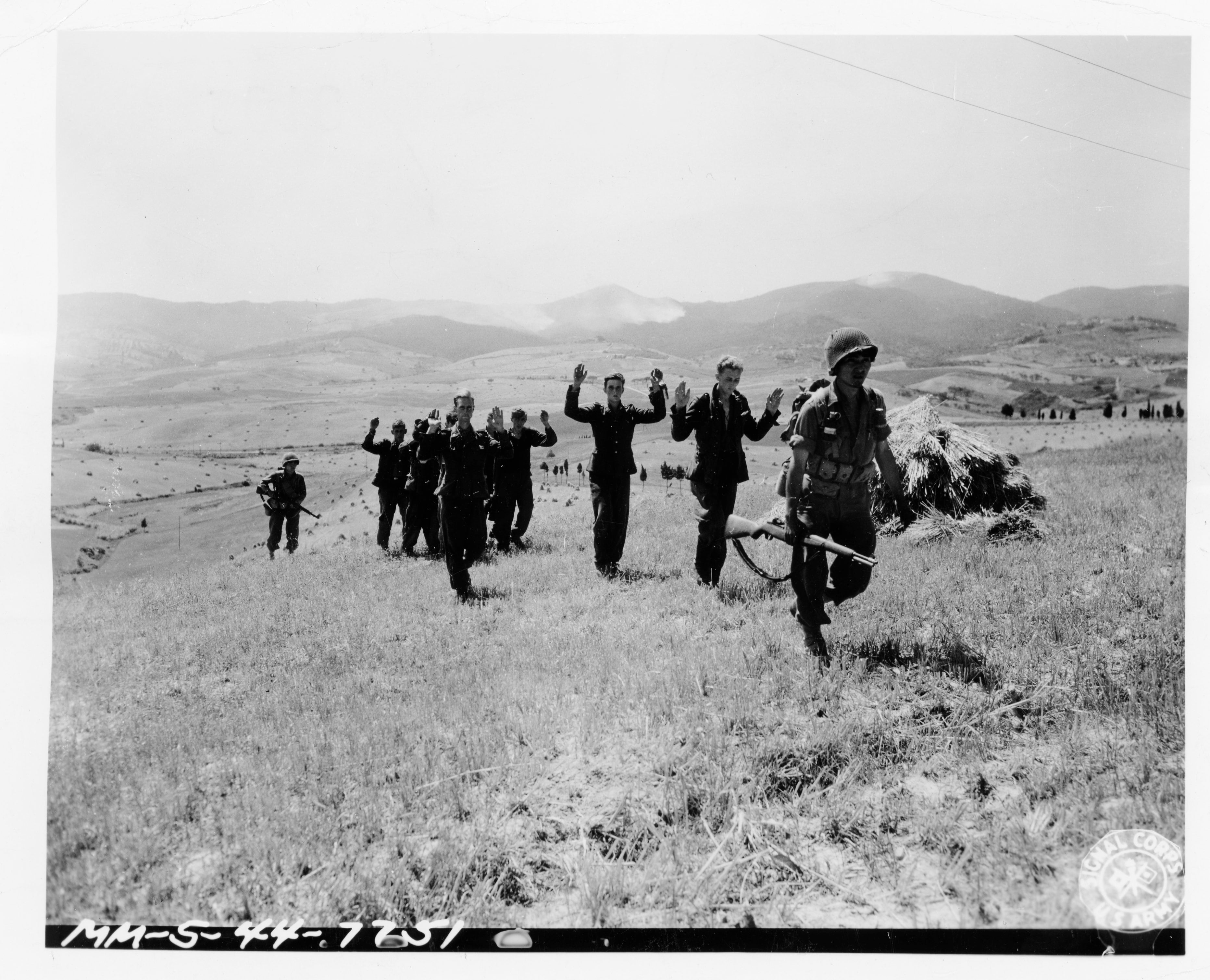 German soldiers surrender to riflemen of the 100th Infantry Battalion after a short but rather sharp exchange of fire. Orciano area, Italy, July 15, 1944. (National Archives)