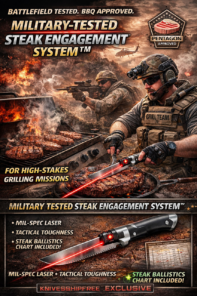 “For any enthusiast of modern tactical knife design, the average steak knife is, frankly, prehistoric,” Rouch tells us via secure telecom call from the off-shore KSF Research Facility. “We don’t fight with sticks and stones anymore, or ride around on sabertooth tigers; so why are we still cutting our dinners like cavemen?”